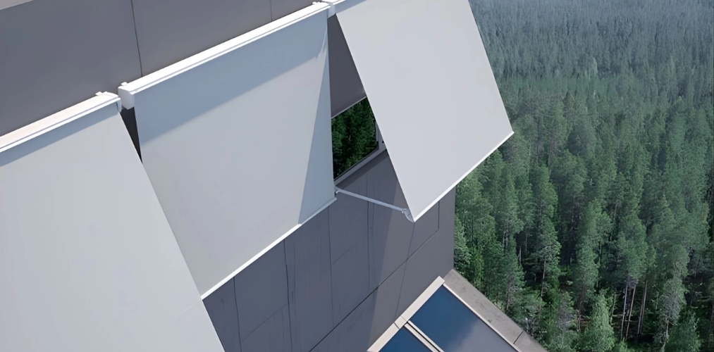 - Το σύστημα κάθετης εξωτερικής σκίασης με πλαινούς οδηγούς η ντίζες είναι μια ακόμη επιλογή σε περιπτώσεις που έχουν έντονη ηλιοφάνεια κύριος στην δύση του ηλίου η καταστήματα με μικρά πεζοδρόμια πού οι βραχίονες ενοχλούν .