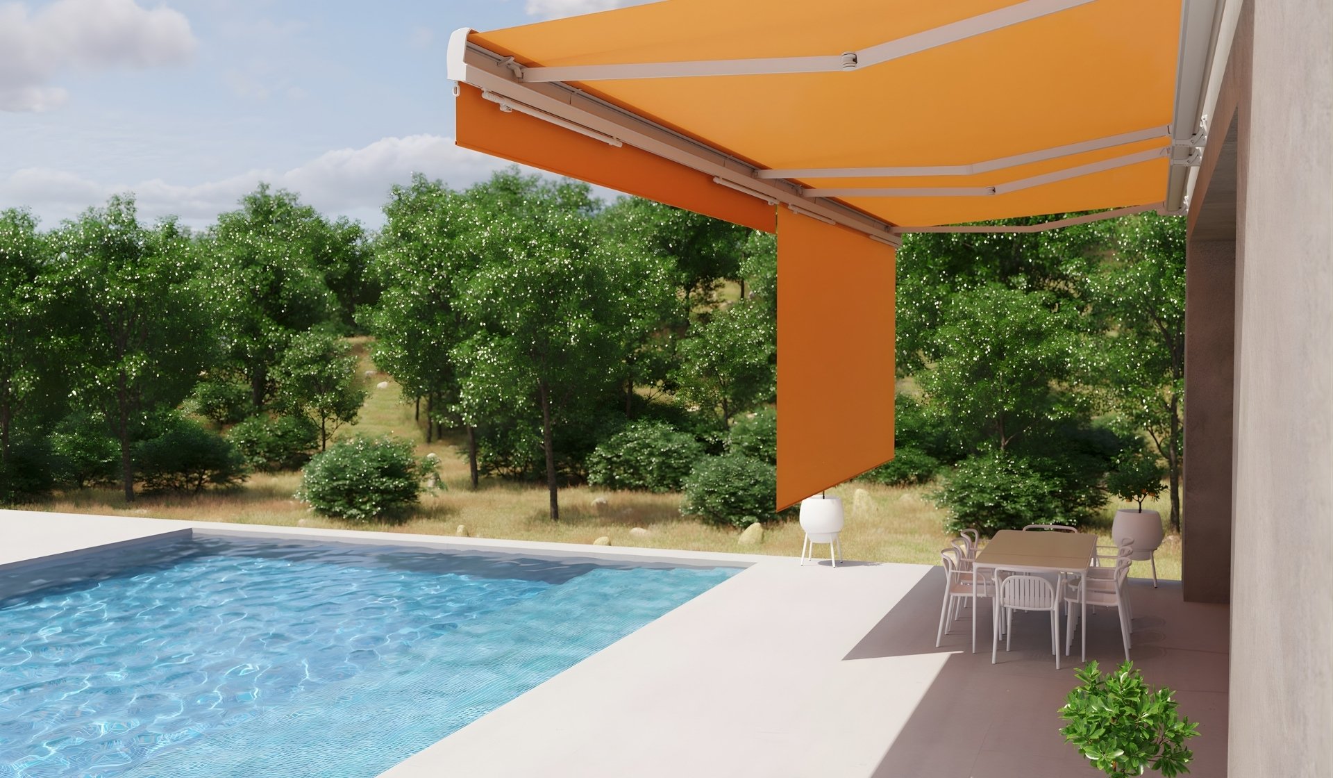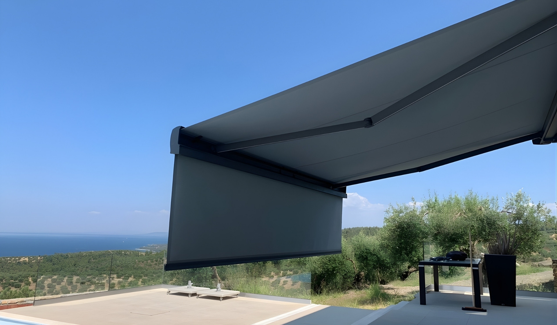 Τέντα σε προστατευτικό κουτί κλεισίματος εξαιρετικά αθόρυβο. Σύστημα πολλαπλών βραχιόνων στη σειρά Concept ή Premium κατόπιν αιτήματος.