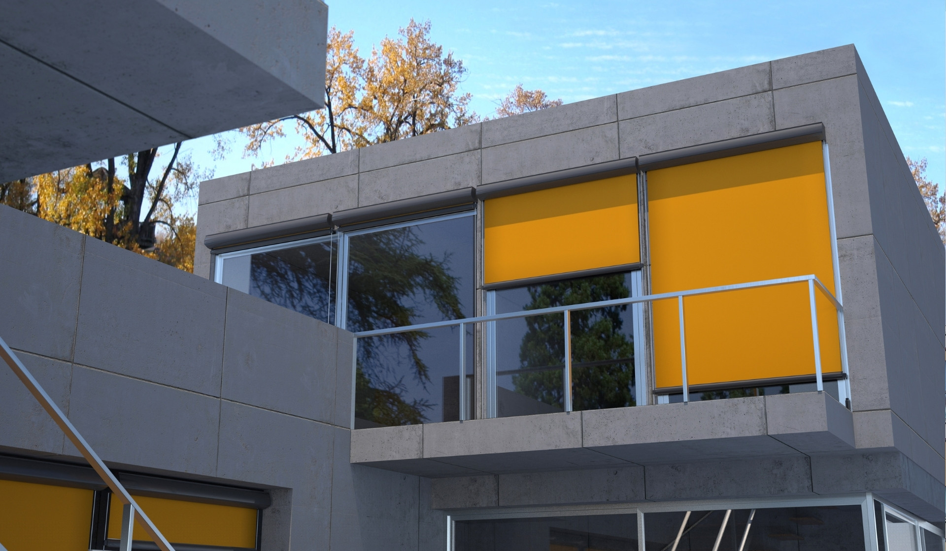 Κάθετη τέντα με οδηγούς αλουμινίου με υψηλή αντοχή στον άνεμο, εγγυημένη από το σύστημα στεγανοποίησης ZIP και το κουτί προστασίας του υφάσματος. Εγκεκριμένο στην κλάση 3.