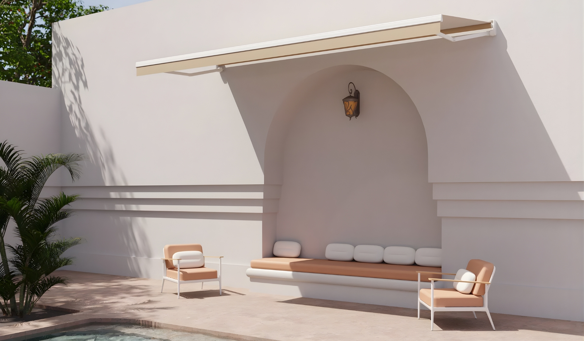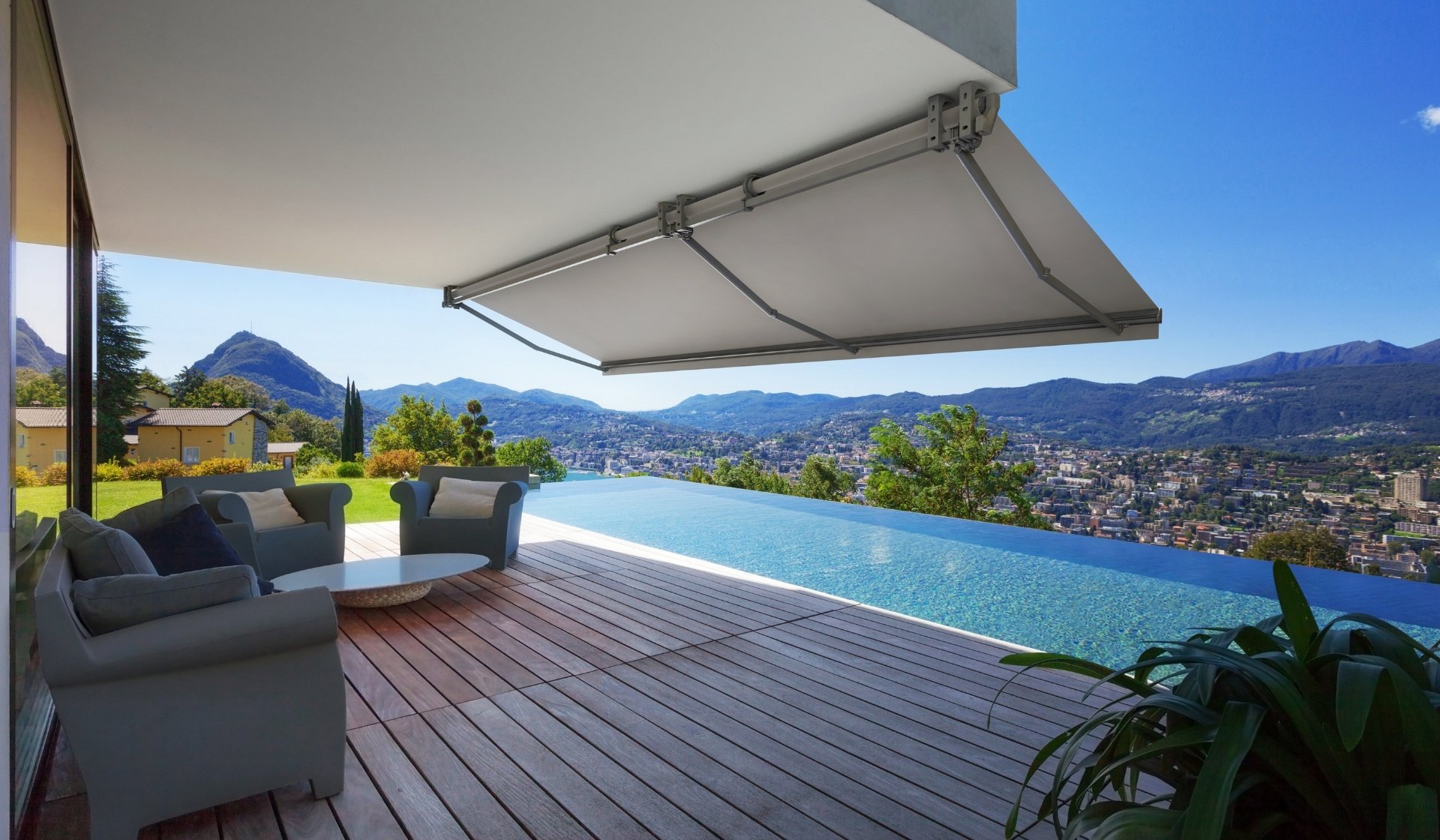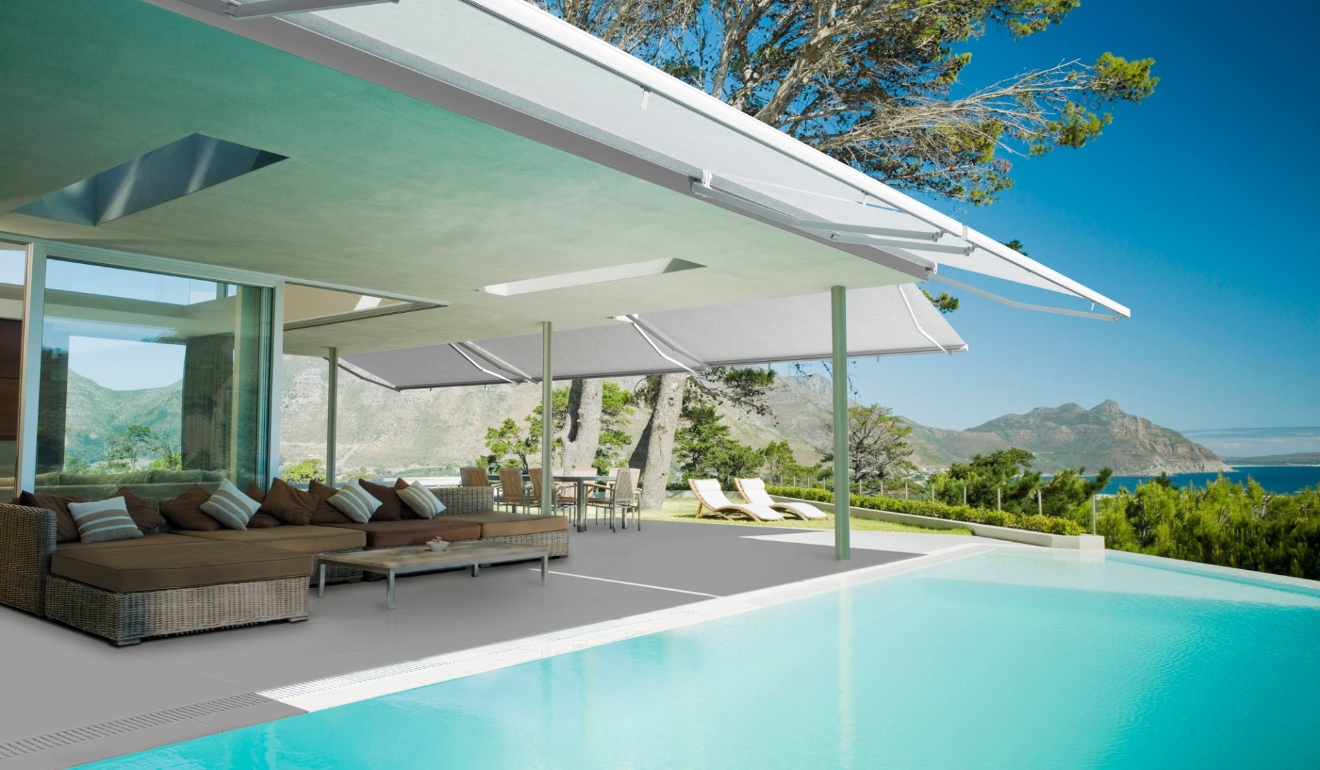 Extendable arm awning with separate brackets and universal anchoring for ceiling, wall, or side installation. Arms equipped with double steel cable covering.