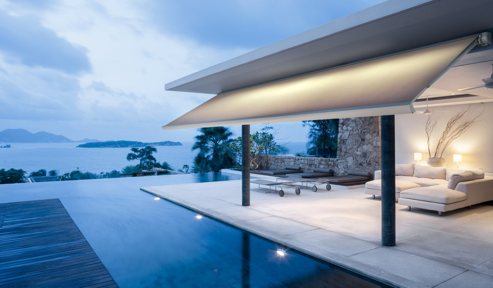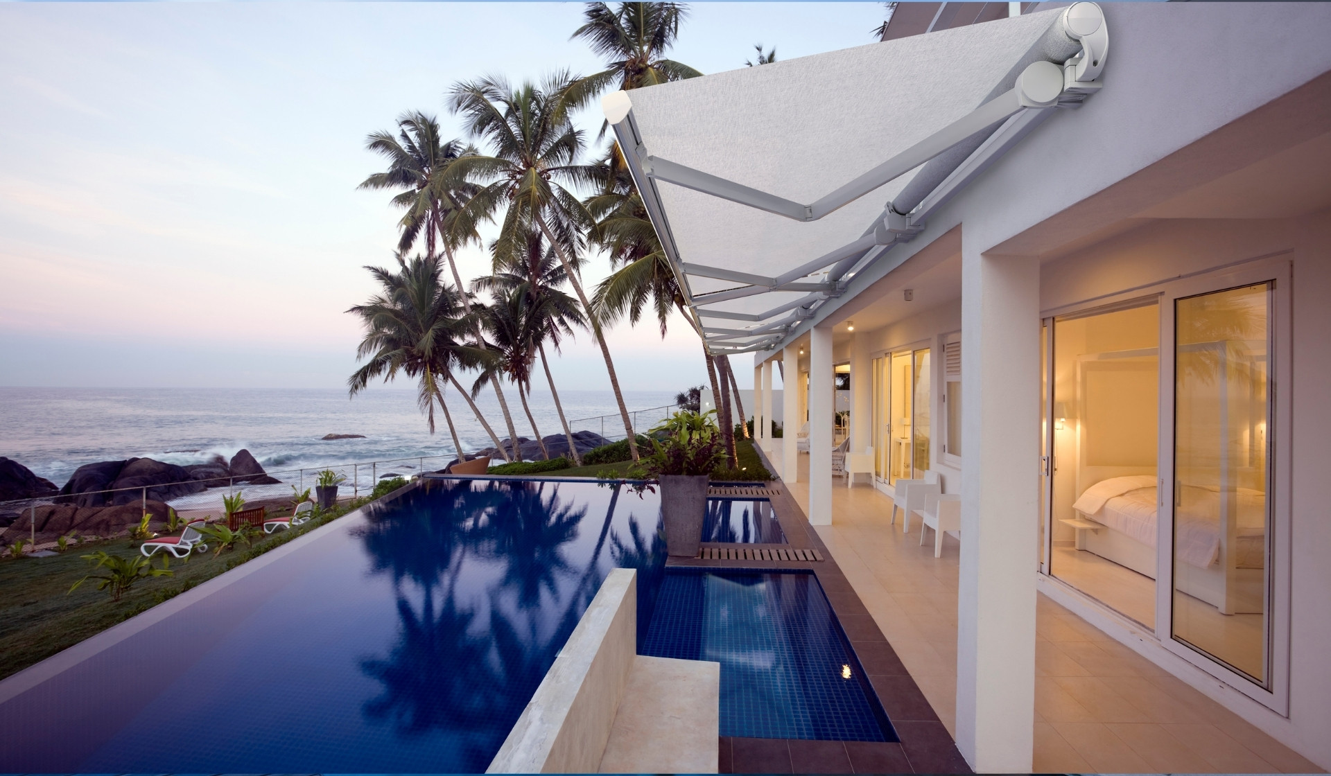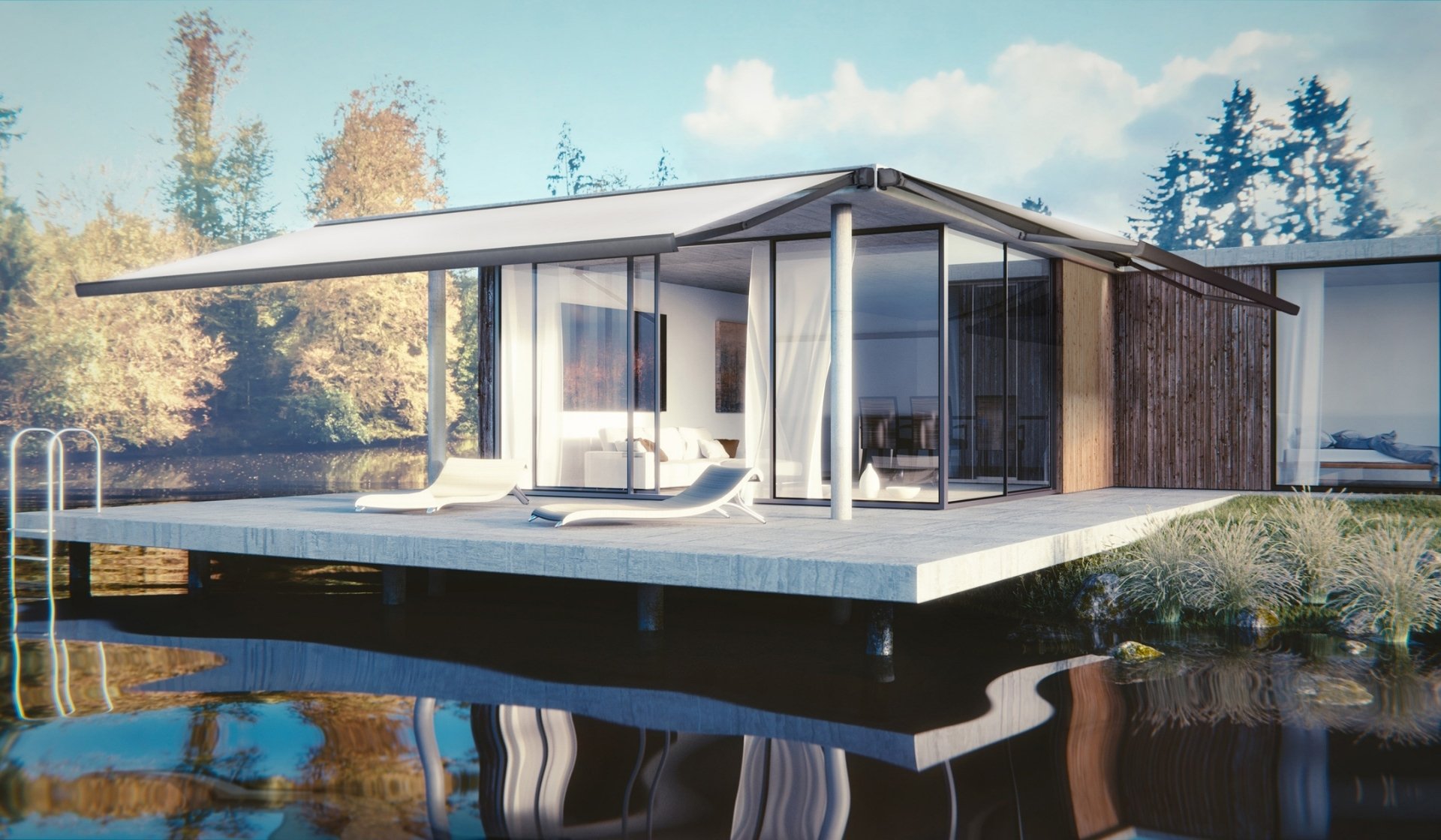 Folding Awning with a compact, fully enclosed cassette, completely hidden and extremely quiet. Designed to accommodate integrated LED lighting in the cassette. Arms feature straps.