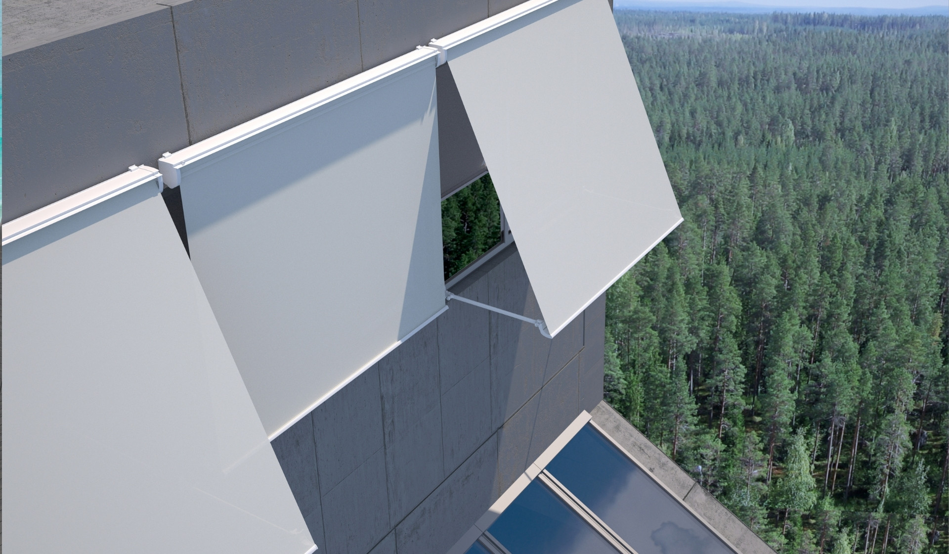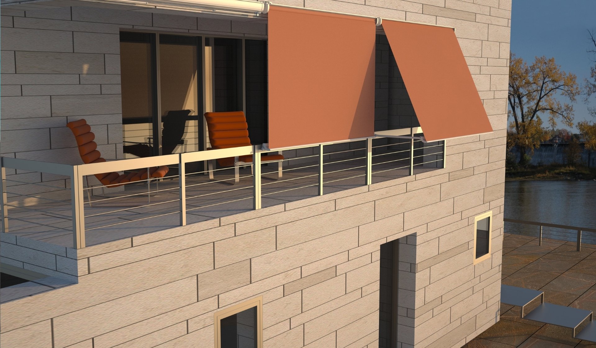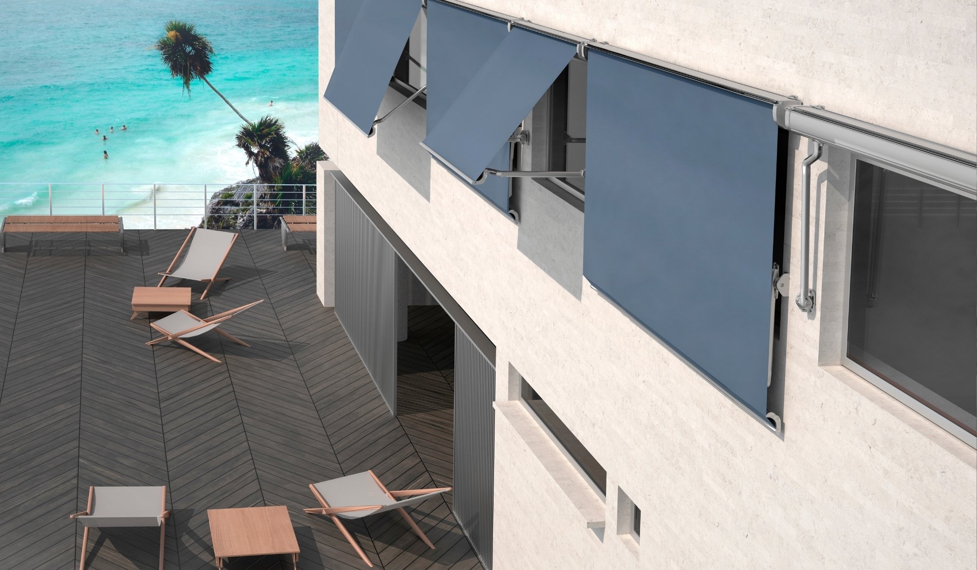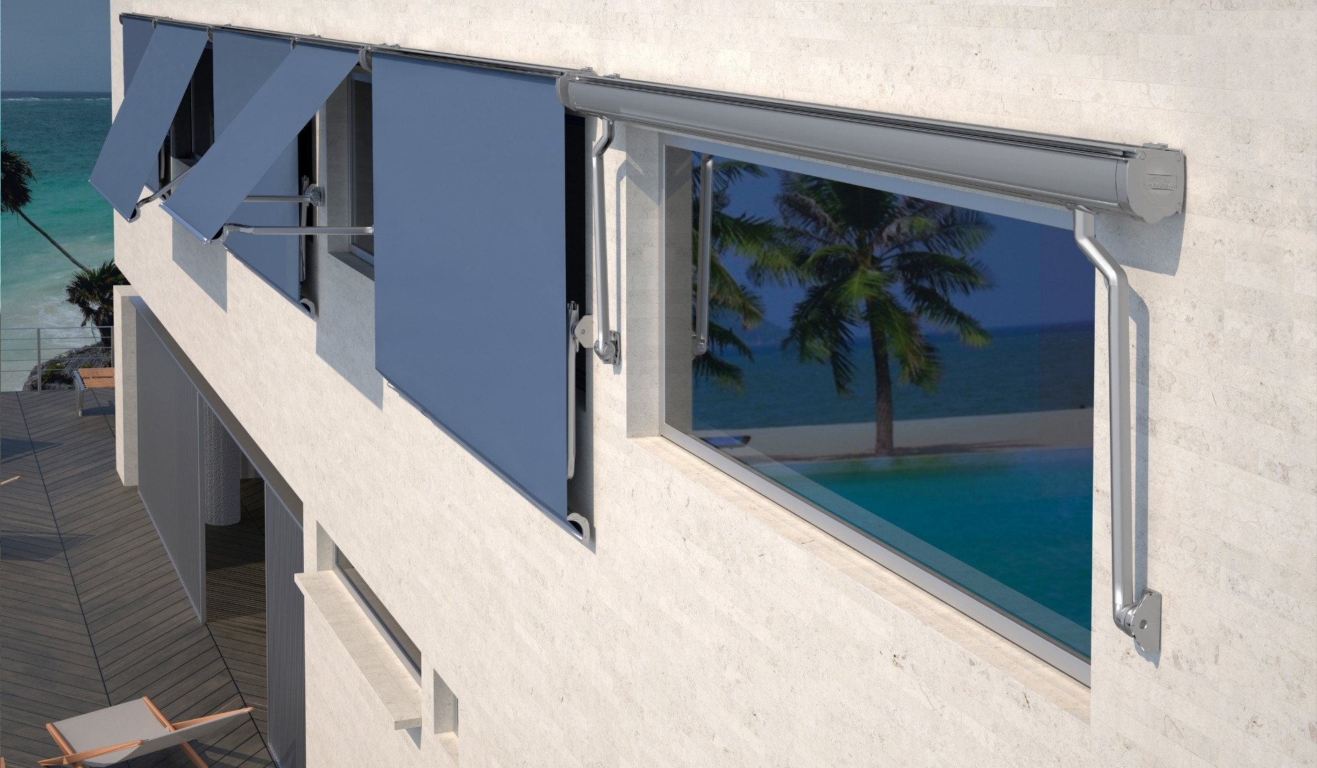 The DESERT D1 box features an advanced design with smooth, rounded lines, making it easy to integrate into the building’s façade and windows. It allows installation either with curved arms or a balcony system. This is a very modern, self-protecting, and hermetic closure awning. The operational range for downward rolling reaches 180º, and the components can be painted in any color scheme to match the window frame’s aluminum. The internal tension of the curved arm decreases as the awning rolls up, preventing unnecessary effort when closing or keeping it stationary.