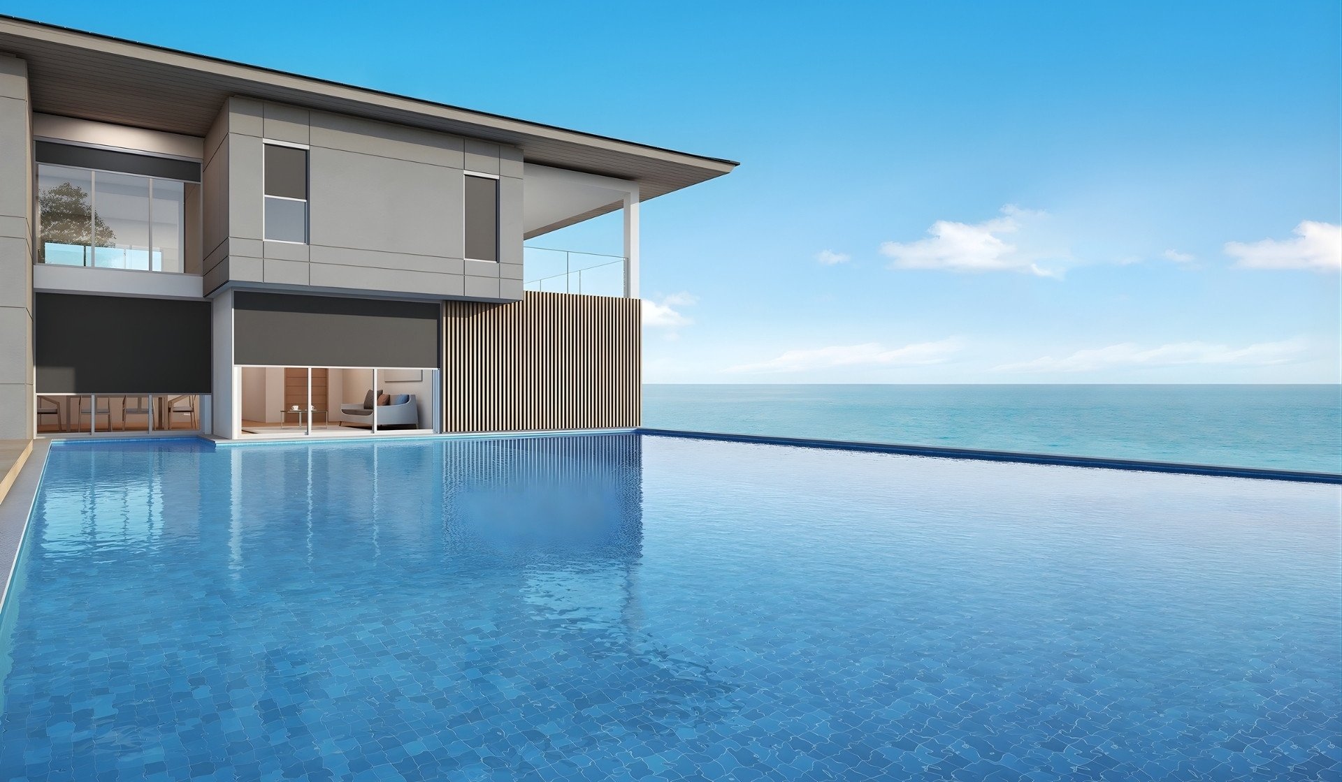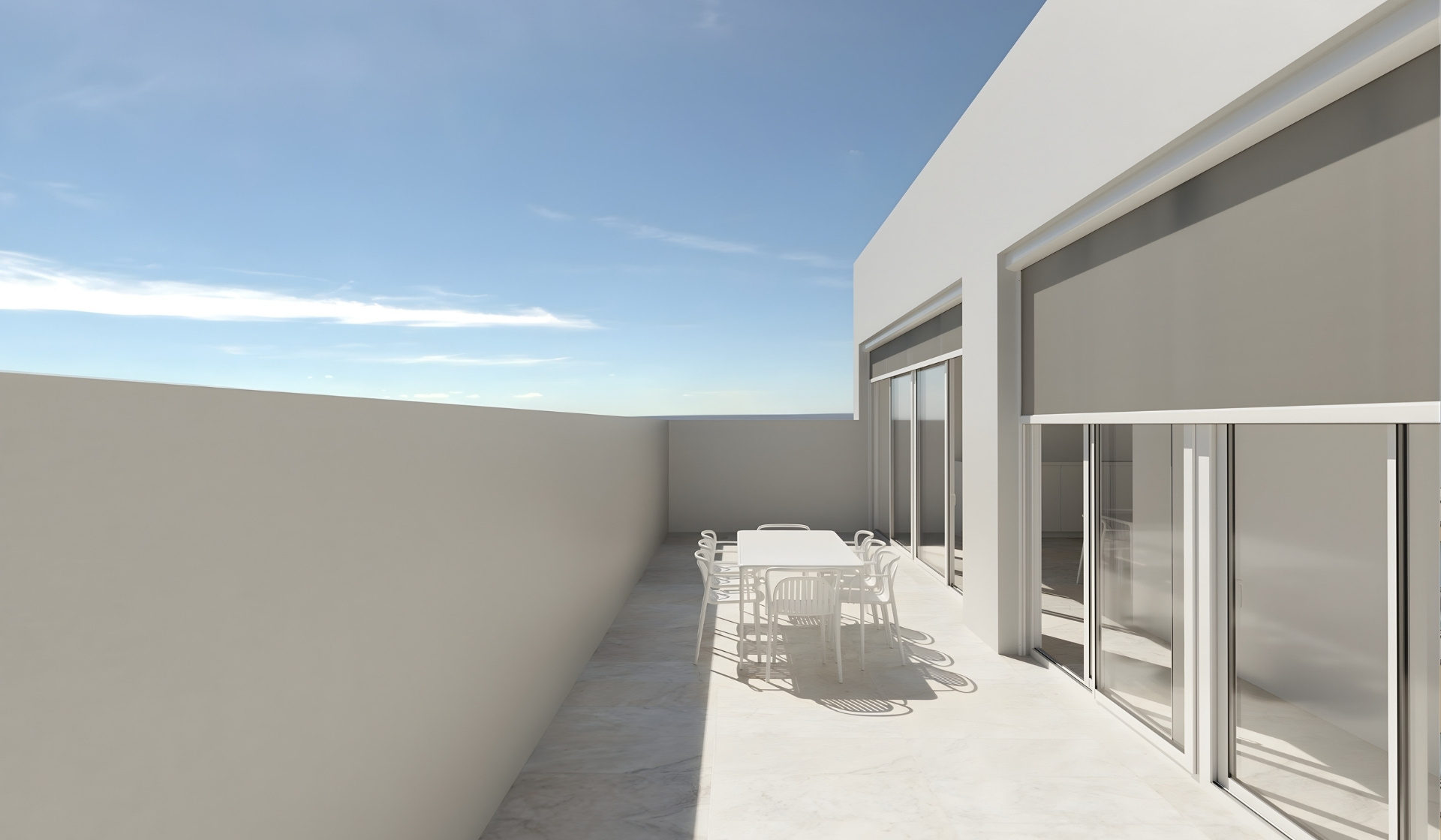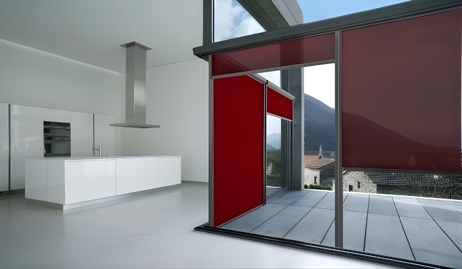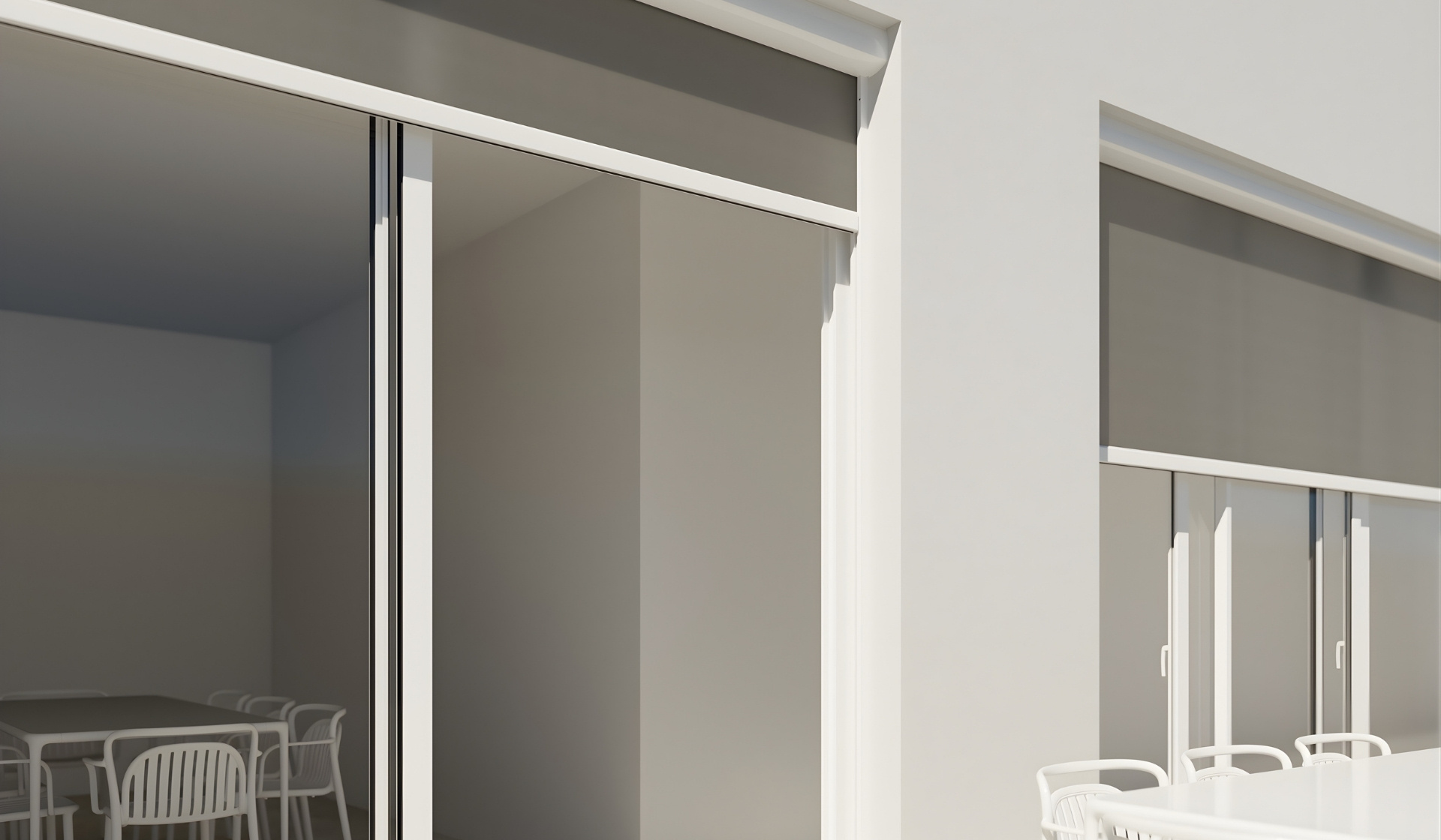 Vertical awning with aluminum guides, offering guaranteed high wind resistance thanks to the ZIP system and fabric-protecting cassette. Certified in Class 3.